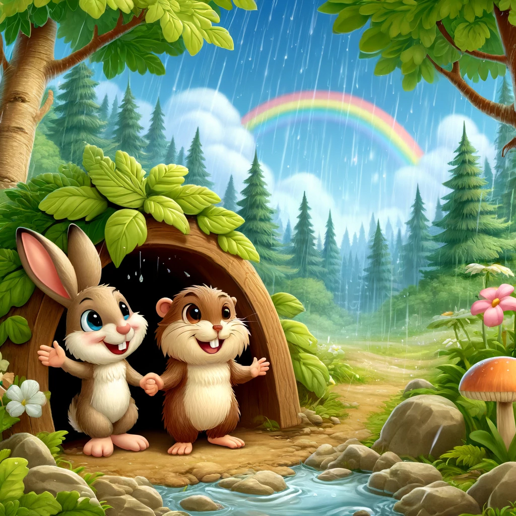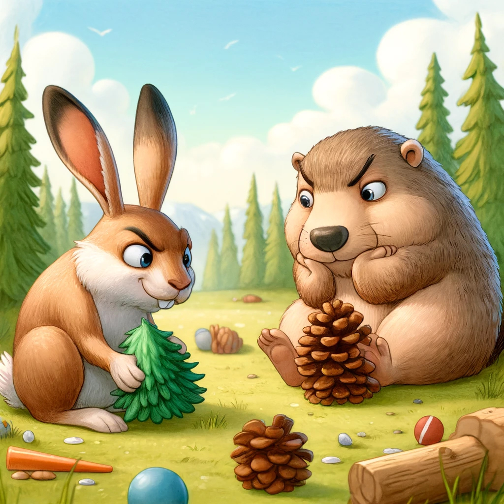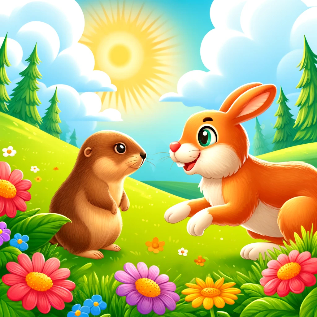 Rencontre dans la forêt : Léo le lièvre rencontre Mia la marmotte sous un ciel ensoleillé.