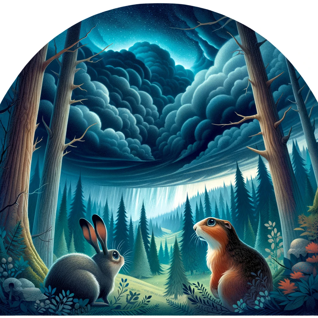 Arrivée de la tempête : Le ciel s’assombrit soudainement, annonçant une tempête imminente.