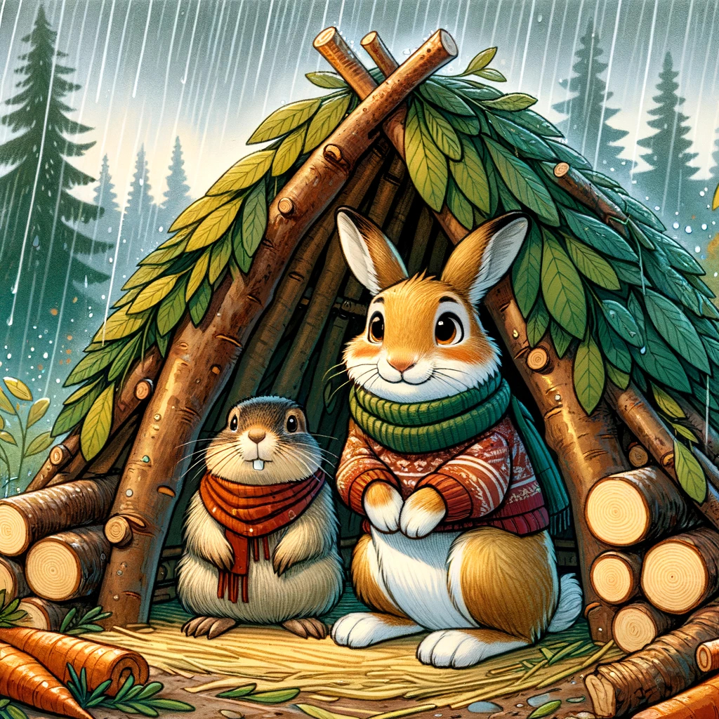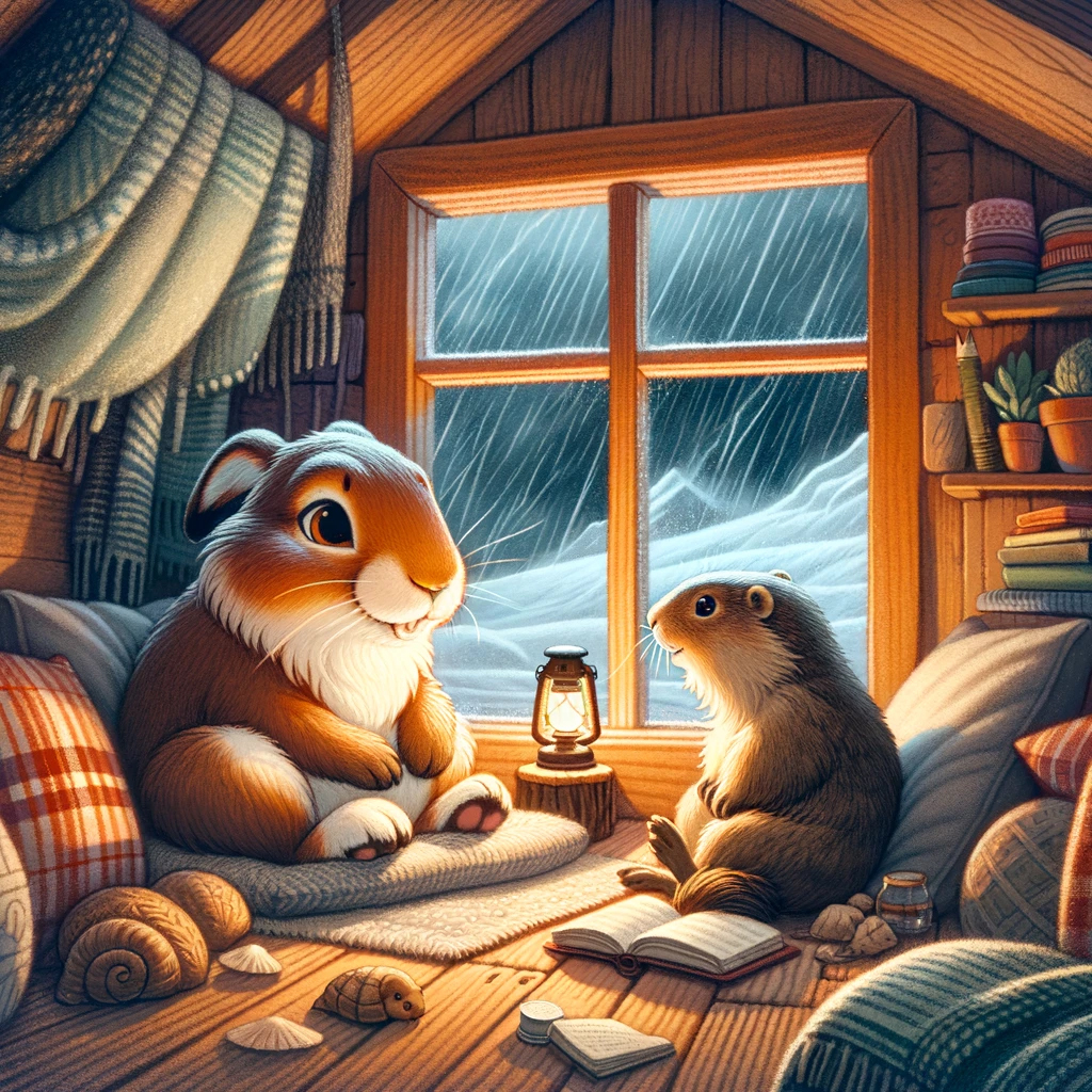 Partage dans l’abri : À l’intérieur de l’abri, ils échangent des histoires et des rires pendant que la tempête fait rage dehors.